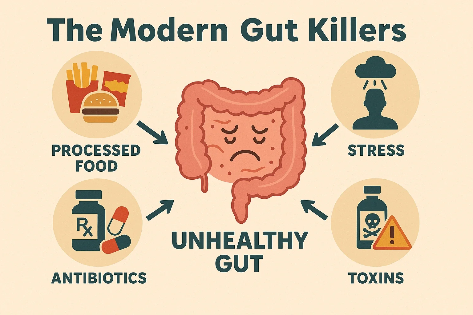 The result? Your gut transforms from a thriving ecosystem into a wasteland.